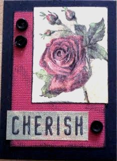 I made this card for Anne in Australia for a black and red ATC swap sponsored by Card Workshop. Black and red is one of my favorite color combos – it’s so dramatic and sophisticated! I knew from the start that I wanted to use this vintage rose image for the card – I distressed the edges to make it pop, and distressed the cardstock to tone down its brightness. I was thrilled to receive the tiny buttons from my friend Elaine in time to incorporate them into this card – they add the perfect finishing touch!