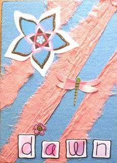 The first card I made in this series was for Dawn. When I read through her list of favorite things, three things caught my eye: her love of unusual backgrounds, her love of dragonflies, and her love of flowers. I knew from the start that I wanted to incorporate these three elements into her ATC.