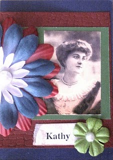 As many of you know, I do my best to customize each card based on my impressions of the recipient. I’ve been reading Kathy’s blog, Inkin’ It Up, for quite some time now, and I know she has a love for beautiful things, so I decided to give her ATC some vintage flair. I picked a beautiful image from one of my Altered Pages collage sheets (I really love their images and Jackie, the owner, is the best!) and offset the image against a backdrop of deep rich colors to give it a heritage feel. I added the flowers and pearls to frame the photo and the name, and I lightly distressed the name label with Tim Holtz distress inks.
