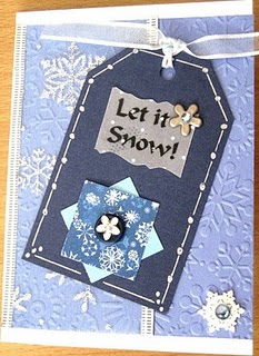 To create this card, I layered some sheer and glittery ribbon over a sheet of embossed cardstock, and adhered that to the card base. I then dressed up a tag I had received in a swap by adding sheer ribbon and bling, and added a button and bling to the bottom of the card for balance. All of these elements, pulled from different sources, blend together nicely for a quick and easy card!