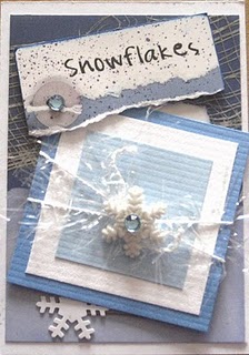 Although my winter stash is small, I had fun finding the perfect embellishments for these cards! On this ATC, I particularly like the crystal blue bling (it reminds me of little frozen dewdrops!) and the whispy tendrils of fiber surrounding the snowflakes (they remind me of delicate icicle tendrils)!