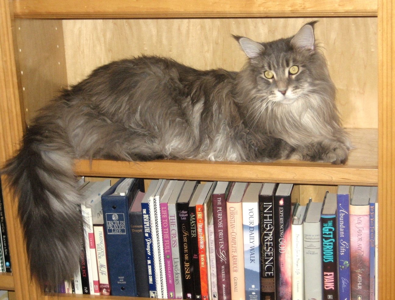 Tsunami and Legend (whose shelf-shot got short-changed due to over-worked camera batteries) are both Maine Coon Cats, a large, working breed native to the US. They are an AWESOME breed aptly nicknamed "gentle giants" – I have had the pleasure of sharing my home with them for close to 26 years now (hmmm – guess that makes me – 30?) – since the first day a Maine walked into my home I have been smitten with this breed and can't imagine life without one. One of these days I will write some posts about this amazing breed since I get a lot of inquiries about them in my e-mail.