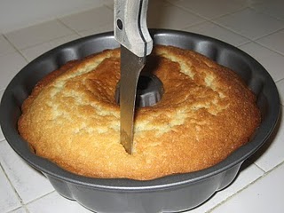 6. Remove the cake from the oven and stab it all over with a knife. Seriously. The more you stab it, the better your rum sauce will soak in.