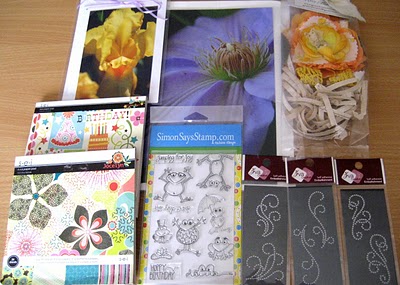 I also received some wonderful gifts this week from my blogging buds, including a card and OWOH photograph from Kathyrn at Sassmowth Designs; a beautiful Summer Gypsy Rosette from Jill at Gypsy Brocante for being her 400th follower; hidden blog candy (SEI paper and bling) from Connie McCotter of McStampin Dusk Til Dawn from the recent Our Daily Bread blog hop; and an adorable stamp set and bling from Sally at Sally’s Creative Corner (be sure to check out her site – each week she spotlights a different company and offers blog candy from them!) Thank you, ladies, for blessing me with these beautiful gifts!
