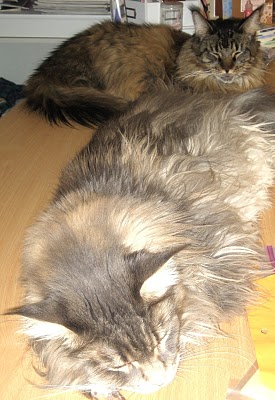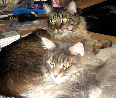 YOUR CATS ARE GORGEOUS!!!! Just had to say that. I love cats…and Maine Coons, in particular, are a weakness. They're so beautiful….and BIG. 🙂