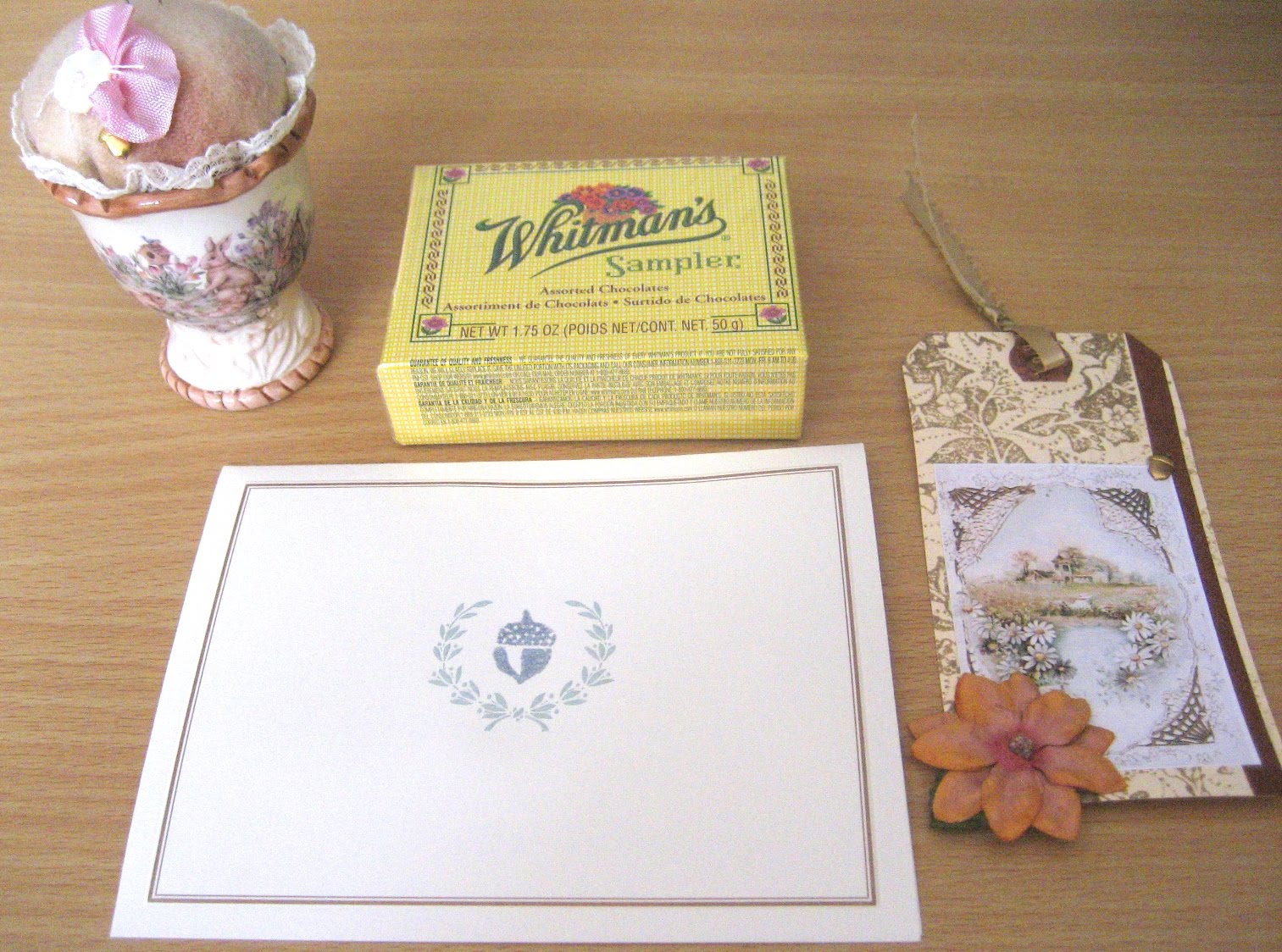 Well, I received my goodies and wanted to say thanks, Donna, for the wonderful note, beautiful tag, yummy chocolate, and awesome Rabbit Garden pincushion! I am so blessed by your thoughtfulness!