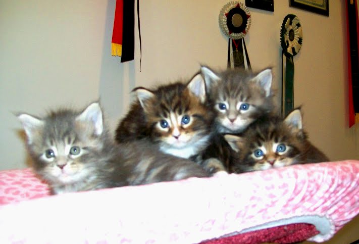 I have a few more baby pictures of him I’ll share later in the week that were taken at about 9 weeks. In the meantime, here’s a parting shot of Tsunami and a few of his littermates on one of the many kitten posts in the kitten nursery – along with some of the many awards their parents have won along the way!