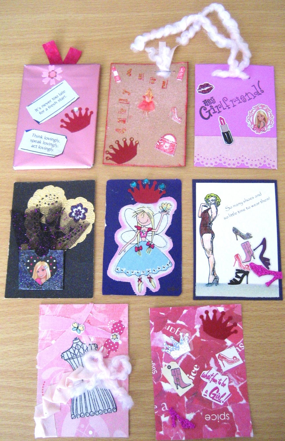 Speaking of swaps – Wendy also enclosed my Girly Swap ATCs from March and I thought you might enjoy seeing what some of my swap partners did with their cards! We all received the same materials to work with for this swap – goodies which included stamped images, ribbon and fiber, stickers, fabric, and an assortment of embellishments. It’s always fun to see how everyone uses the materials so differently – how everyone interprets the theme in different ways – and how various people’s personalities shine through on these swaps!