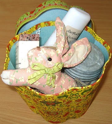 Here is a close-up of the goodies the beautiful box contains. According to CJ’s blog, she only made 20 bars of the beautiful yellow, pink and lavender swirled soaps – she sent me two of them – so when they’re gone, they’re gone! The Tea Par Ti’ lotion is just as wonderful – light, silky, with no mineral oils, lanolin, or alcohol – only good stuff, like cocoa butter and shea butter and Vitamin E! I’m looking forward to lighting the lavender candle – and I adore the pretty pink bunny she sent!