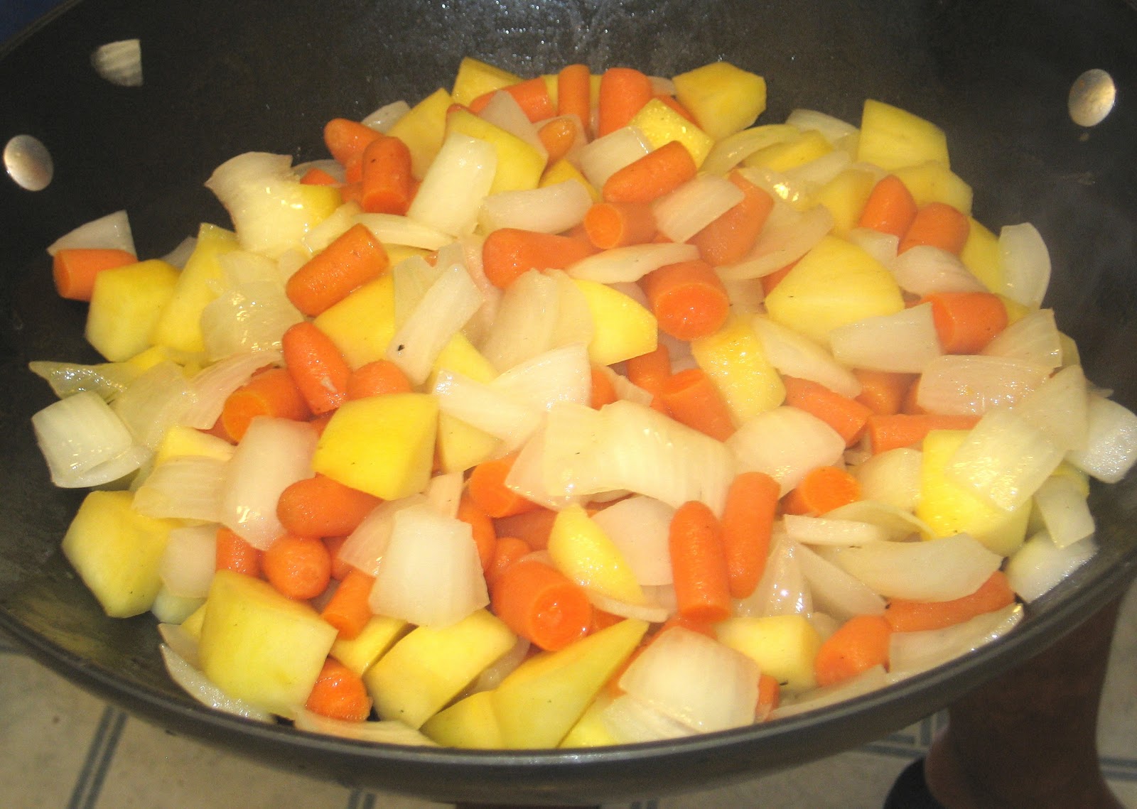 1. In a large work, lightly sauté the carrots, onions, and rutabagas in 3 tablespoons of olive oil until the onions start to soften. Remove the vegetables from the pan and set aside, leaving any excess liquid in the pan.