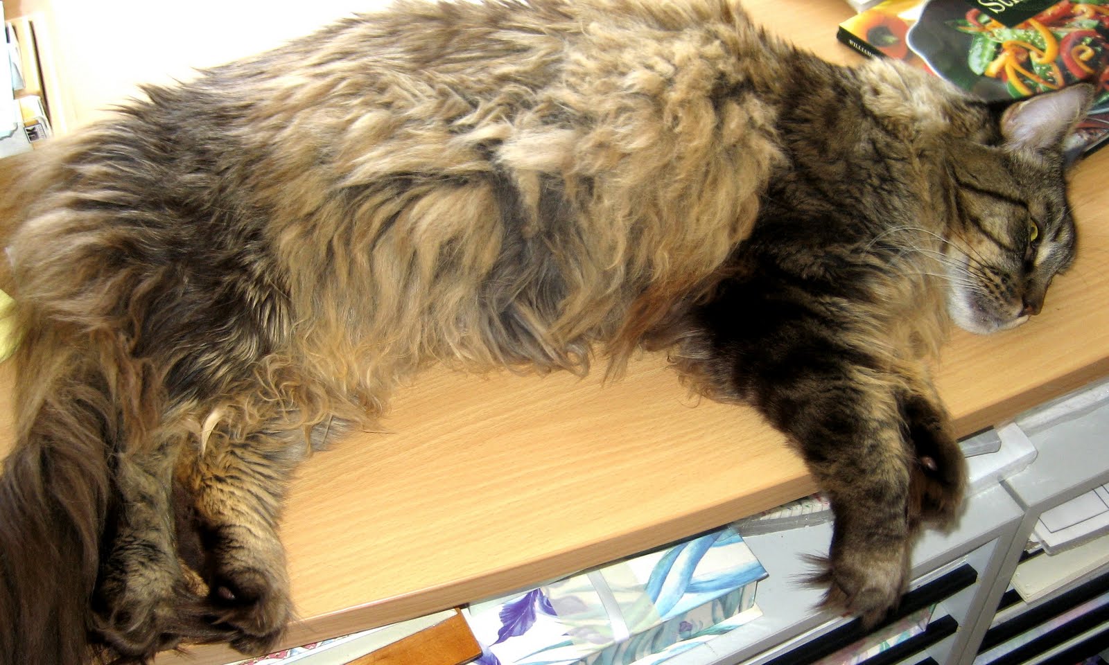 This week I’m catching up on life tasks and trying to clear the ever-growing piles of stuff off of my desk, but there are some things a desk should never be cleared of – with lounging Legends at the top of that list! Today, my faithful Coon Cat is so tired, he didn’t even look up when the paparazzi came in to snap a shot! For the past several days, he has been following me every where I go – every time I wake up, he is right there looking over me! We were apart a few times this week – a rarity for him. Obviously, he did not think much of the separation!