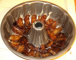 6. In a highly buttered Bundt pan, arrange the Caramelized Apples along the ribs of the dish.