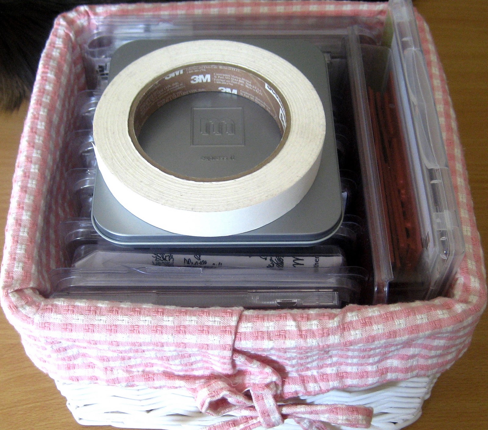 Finally, I placed all of my unmounted rubber stamp cases – plus a roll of low tack tape, which I use on the stamps that don’t have EZ Mount – in a pretty basket. That makes it easy to find my unmounted rubber stamp collection when I need it!