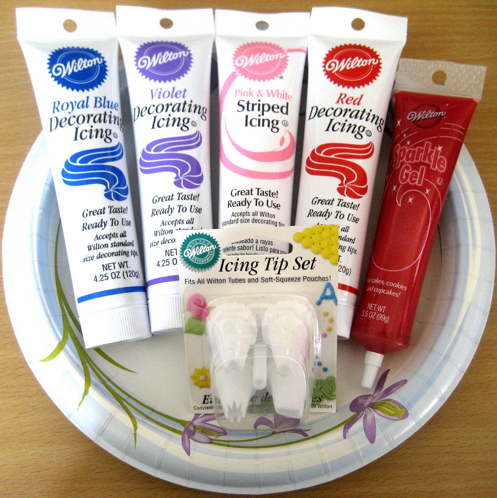 I thought it would be fun to try my hand at creating Valentine Cookie Pops, which are essentially Valentine-themed cookies on a stick, then arrange them into a creative bouquet for gift giving (if, indeed, they last that long!) Since I’m new to the world of cookie decorating and lack the tools to do it properly, Prince Charming – never one to stand in the way of progress – rushed to the store and surprised me with a bag full of baking delights! My mind is racing with possibilities as I admire the pretty tubes set before me. Although it may be a few days before I have a chance to make them – I’m looking forward to the chance to play!