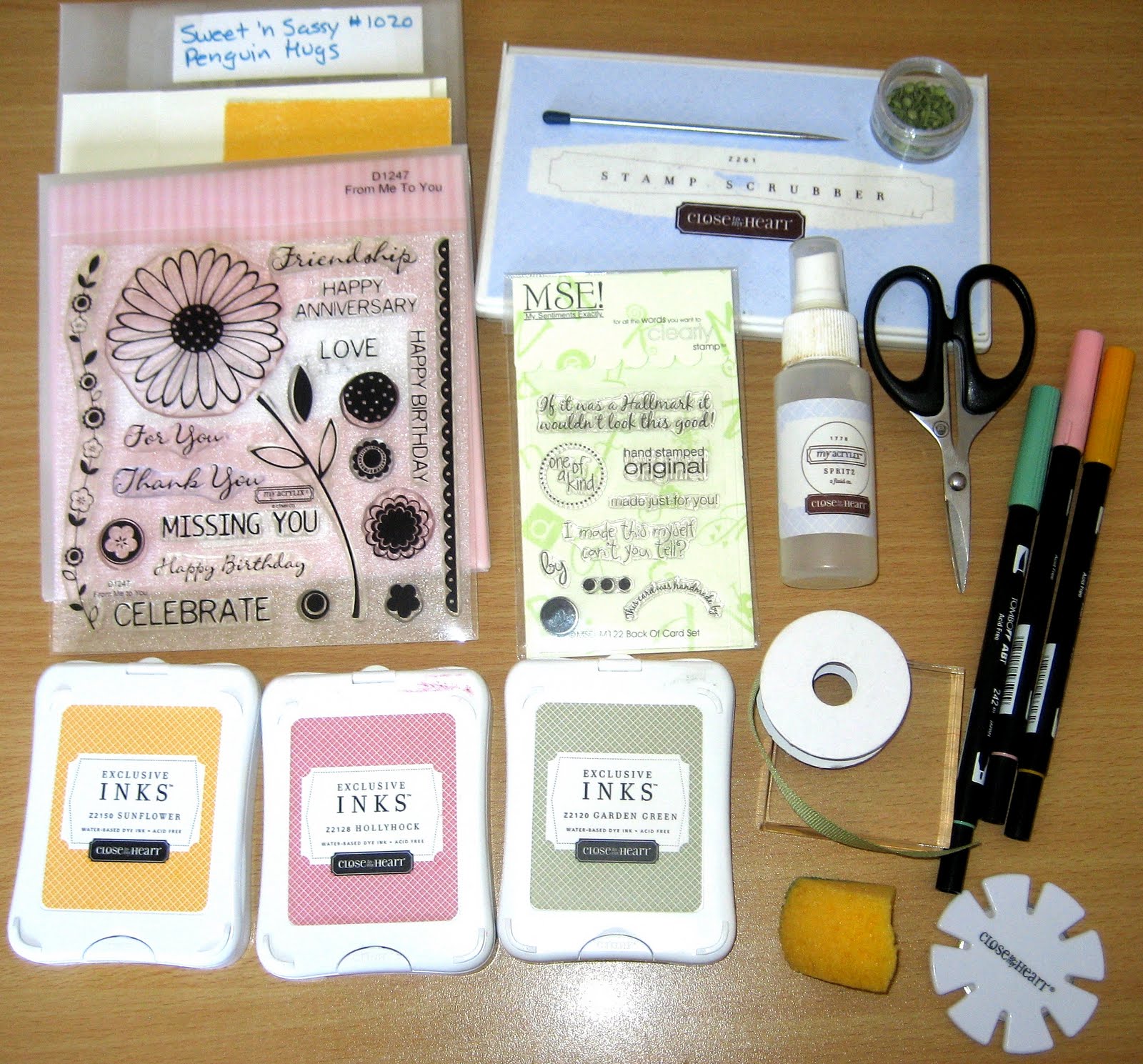 Today’s photo contains a bunch of the supplies I used to create my latest card. I stamped – I colored – I distressed – I added a few embellishments – that’s all. No hot new techniques, no fancy schmancy tools or products. And, look at all of the products I pulled out!